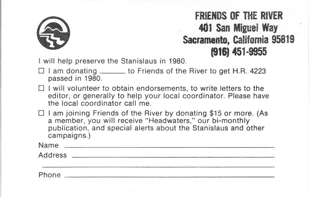 This card (jpg image) was included in the adjacent brochure, “The Stanislaus River Canyon”, in support of passing HR 4223, a congressional bill to protect the Stanislaus River.