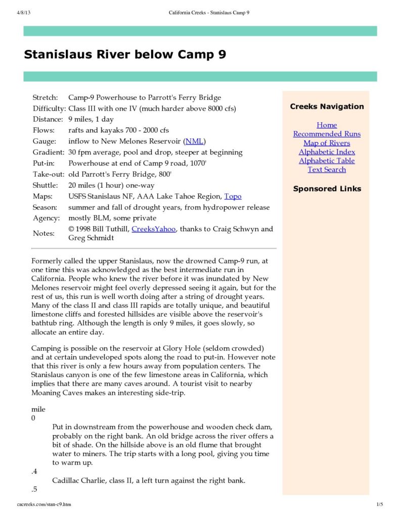 Mile by mile guide to the upper 9 miles on the Stanislaus, after the flooding. Very detailed and useful. “Formerly called the upper Stanislaus, now the drowned Camp9 run, at one time this was acknowledged as the best intermediate run in California. People who knew the river before it was inundated by New Melones reservoir might feel overly depressed seeing it again, but for the rest of us, this run is well worth doing after a string of drought years. Many of the class II and class III rapids are totally unique, and beautiful limestone cliffs and forested hillsides are visible above the reservoir’s bathtub ring. Although the length is only 9 miles, it goes slowly, so allocate an entire day.”