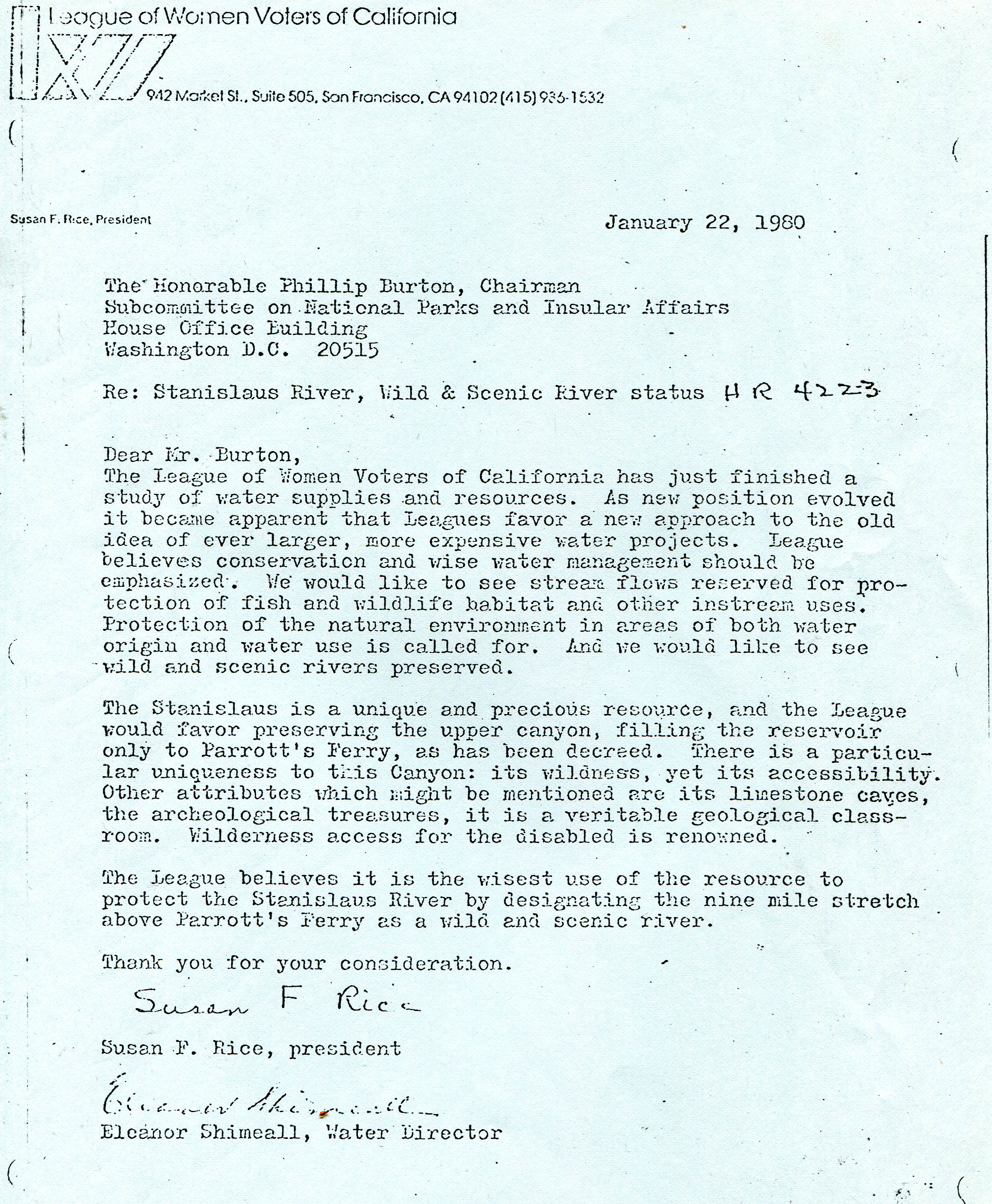 Letter to Rep. Phillip Burton from Susan Rice, President of the League of Women Voters of California