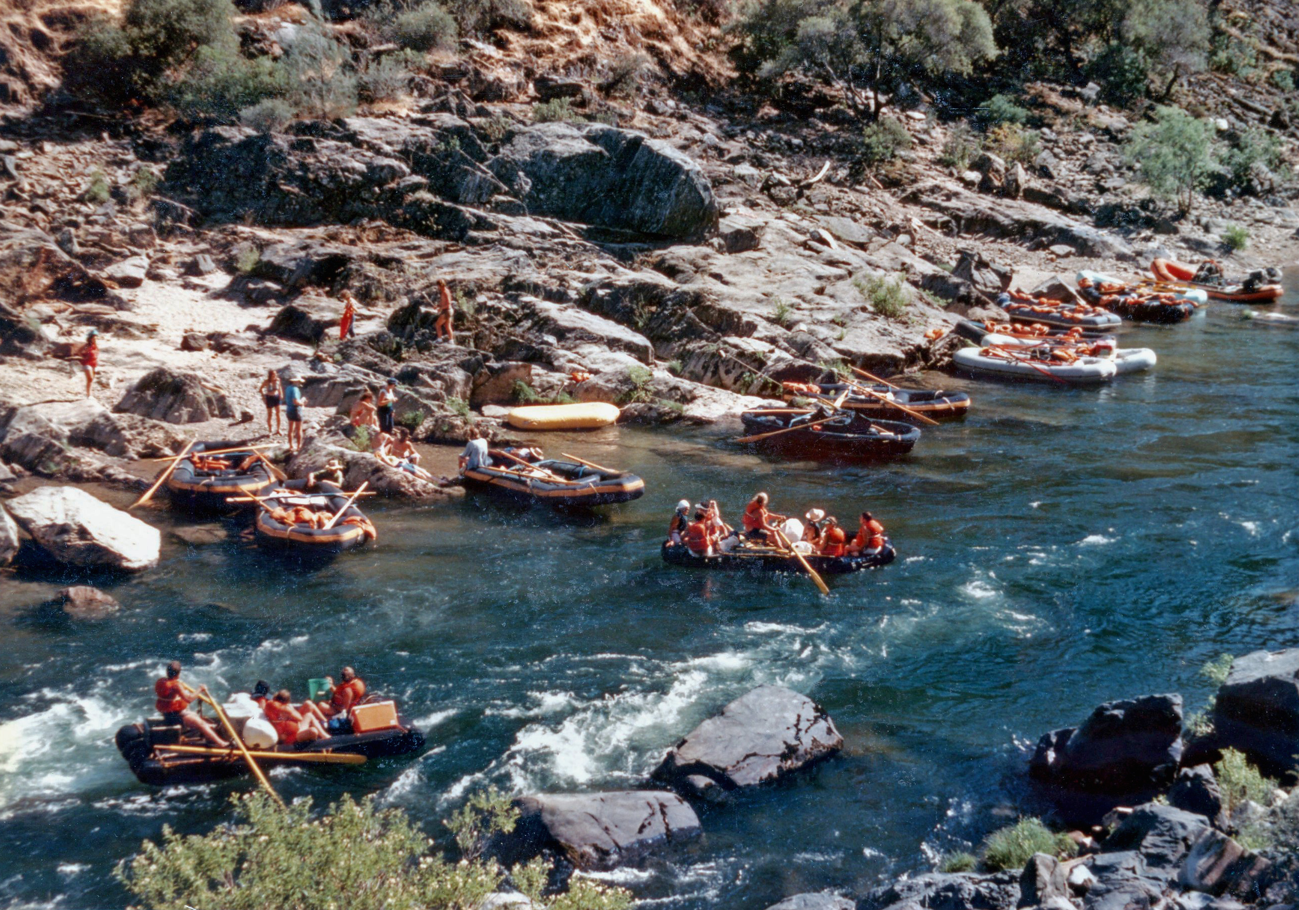 Sierra Mac Huck Finn rafts pulling into Rose. Boats from John Vail’s company have the distinctive orange stripe around their tubes.