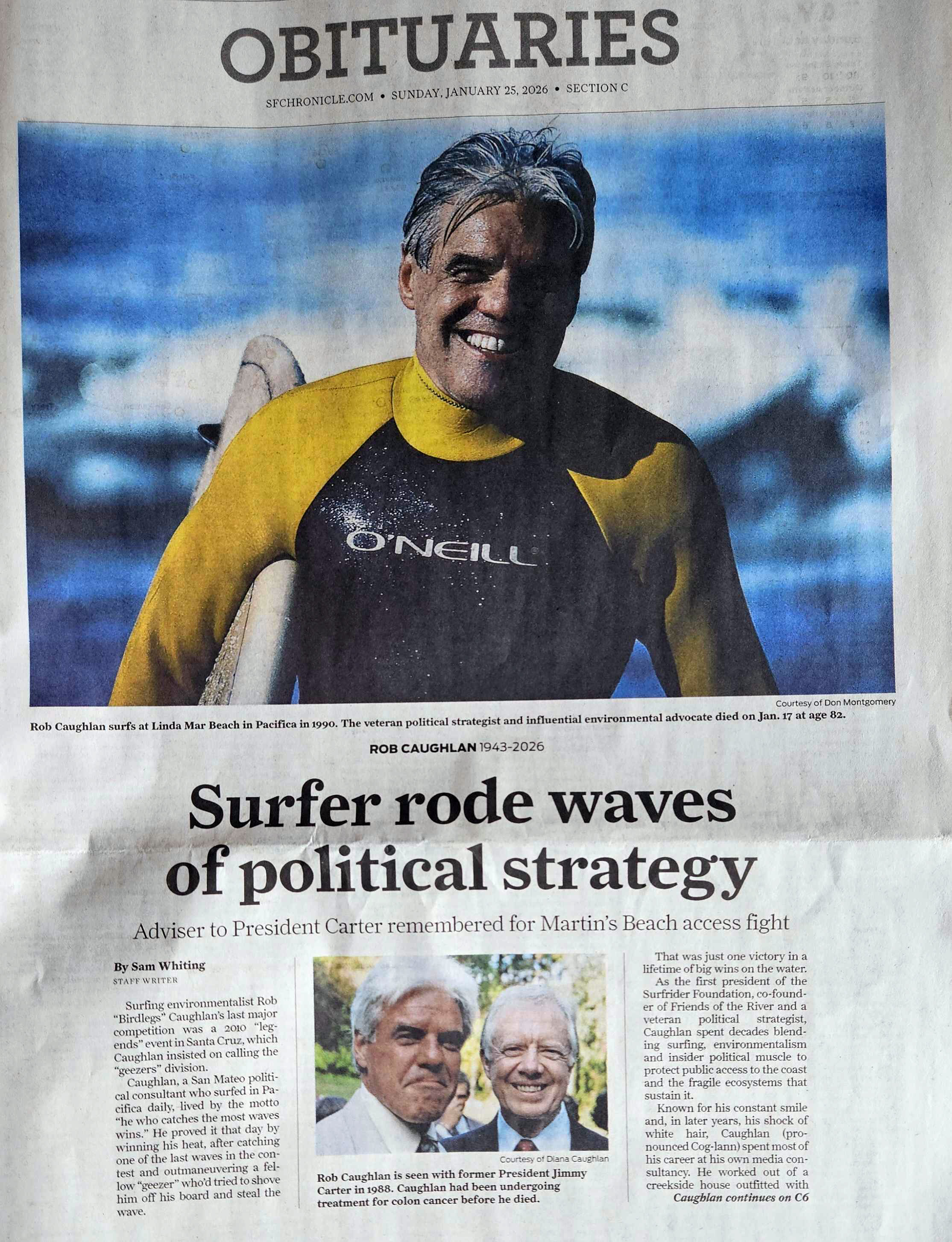 Rob Caughlan was an amazing and unique person – he passed away in January of 2026 at 82 years of age. See more about Rob in the Archive here. The Proposition 17 campaign in 1974 was one his very first forays into political consulting, as he partnered with Jerry Meral, David Kay and others in the incipient Friends of the River organization to help pass the ballot measure to save the Stanislaus River. He always had a twinkle in his eye and an unerring knack for political mischief, always in support of good causes. He had other skills, too – he was most passionate about surfing, and ended up creating the Surfrider Foundation to protect the ocean and surfing, and he was an amazing whittler, presenting those who worked on taking people down the river for Prop. 17 with a hand-carved wood paddle on which was inscribed in flowing water forms, “May you always be befrienders of rivers”. Amen and always find the water, Rob! You can see his full obituary here (PDF 6mb), and a 2020 interview with Rob here.