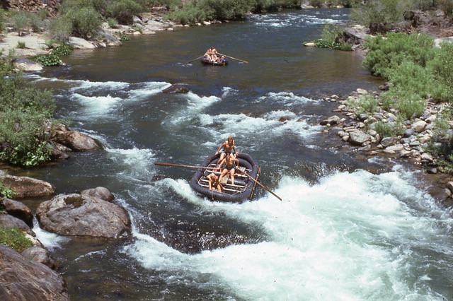 This view of the top of Suspension Bridge rapid shows the upstream, with the end of Rock Garden rapid in the very far upper right. Sharon Coldwell rowing, Ron Coldwell in stern, Hiedi Lovering (?) at the bow.