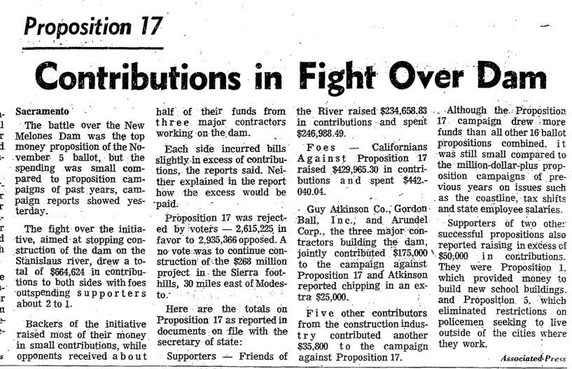 Article reporting on final expenditure totals for Proposition 17 in the November 1974 election. Pro-dam interests spent $430,000, while Prop. 17 supporters spent much less – $246,000. Over half the pro-dam funds came from three large contractors working on New Melones Dam, particularly the Guy Atkinson Company. (Check on whether Prop 17 support included the initiative campaign).